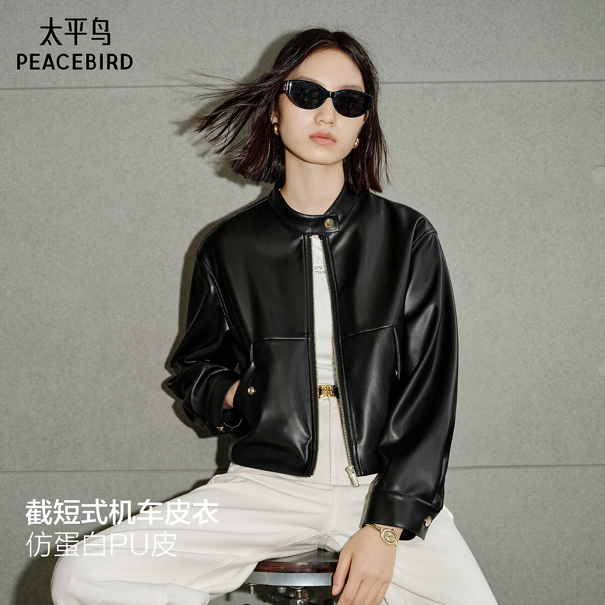 太平鸟女装皮衣金扣小立领仿蛋白PU皮衣外套女截短式机车 黑色 M