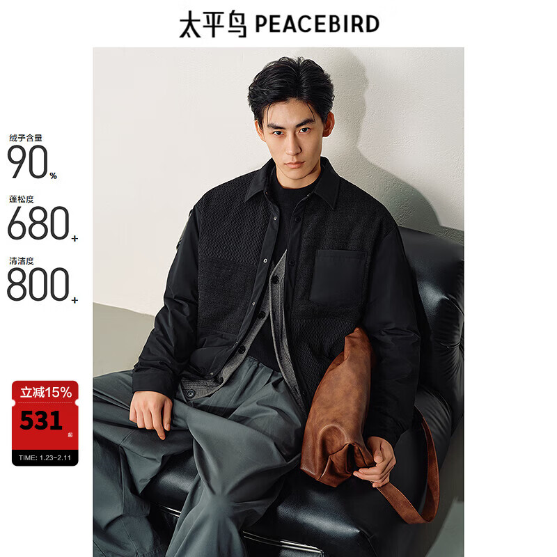 太平鸟男装【衬衫式】 轻薄羽绒服2025年冬季新款提花保暖防寒服 黑色 第一批 2XL