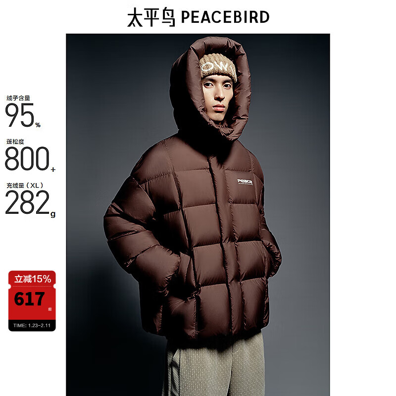 太平鸟男装 【95%进口鸭绒】连帽羽绒服冬面包服防寒短款排骨外套 15D暗影黑(阔型)第二批 XL