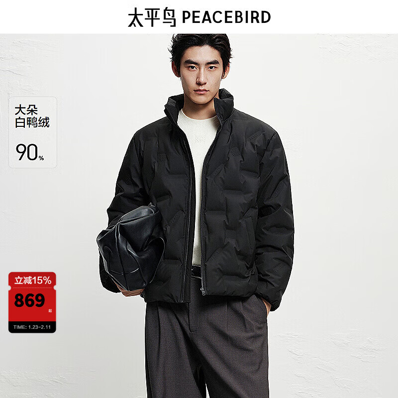 太平鸟男装【压胶】立领羽绒服男2025年冬季新款短款保暖面包服 黑色 第一批 L
