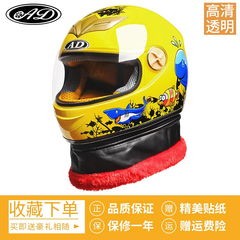 AD新国标儿童头盔电动车头盔男孩女生小孩子宝宝四季通用卡通安全帽女孩冬季保暖围巾全盔电瓶车冬天 围脖【黄鲸鱼】透明镜 均码