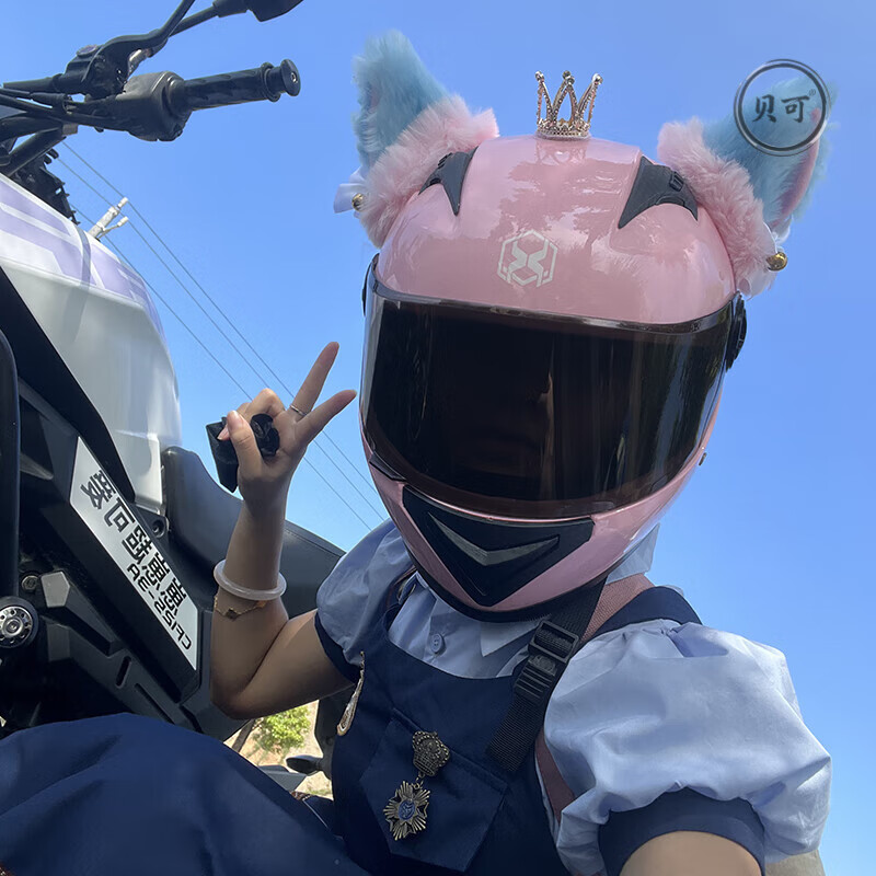 宰搂机车保暖全盔半盔女生摩托车电动车复古盔库洛米3C认证头盔 粉色全盔+送耳朵+玫瑰金皇冠(黑