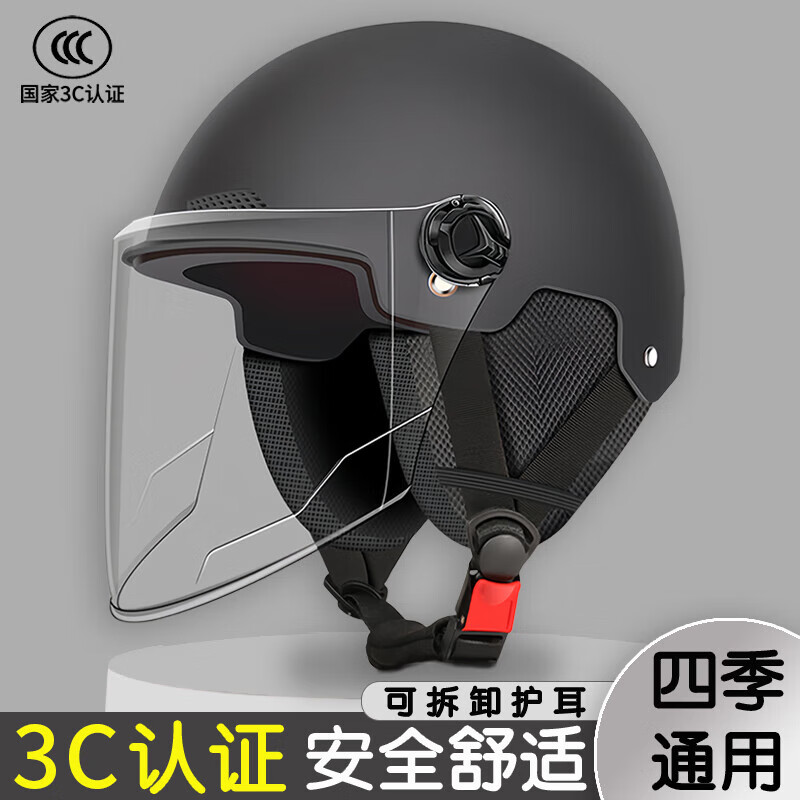 3C认证电动车头盔四季通用轻便半盔秋冬季带护耳防风保暖安全帽电动摩托车男士女生骑行头盔 带护耳-雅黑色