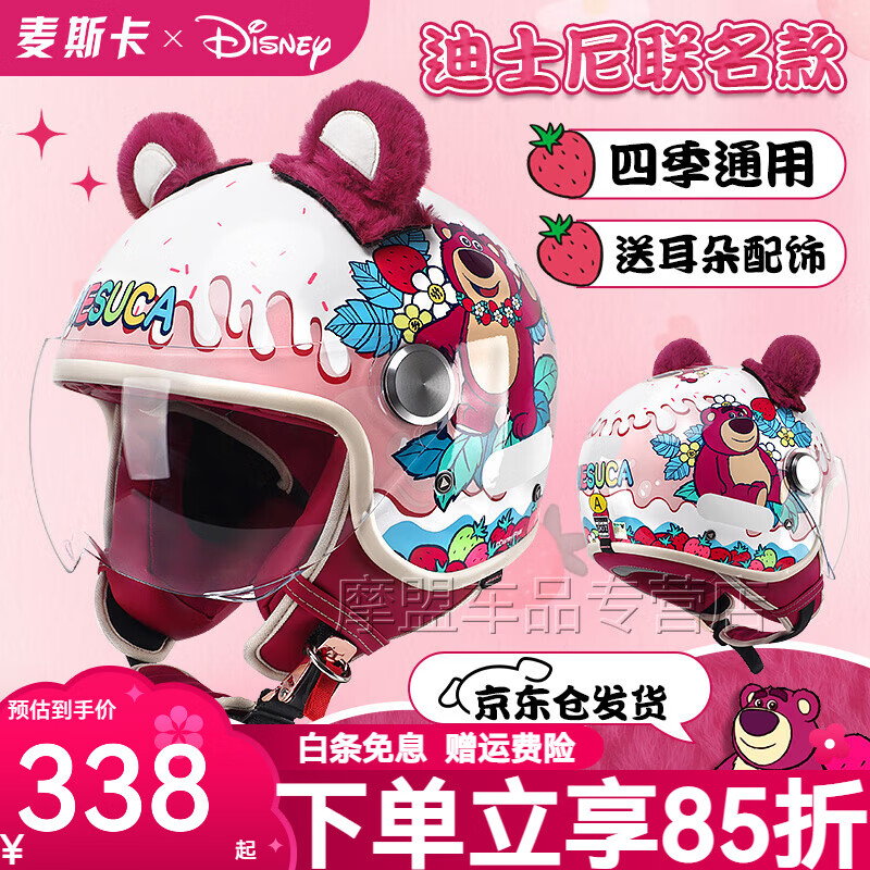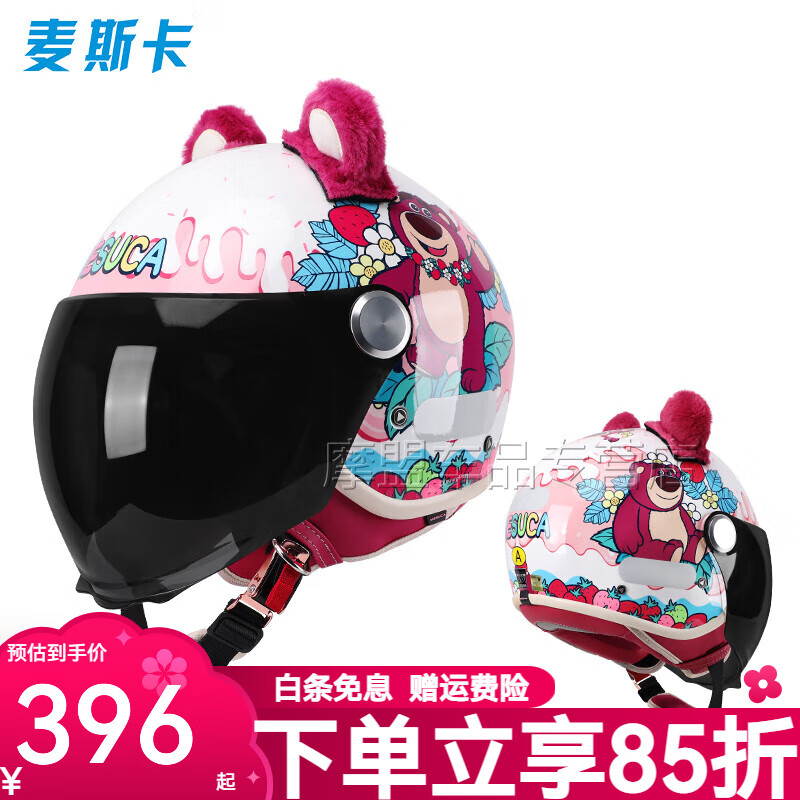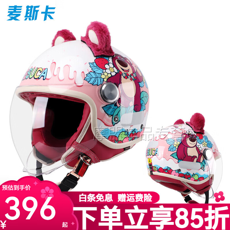 麦斯卡半盔骑行男女生电动车夏季四分之三摩托车复古头盔草莓熊库洛米 草莓熊-白 透明+长黑茶镜片 L【建议55-56】