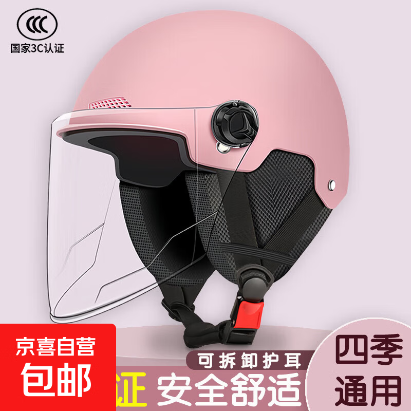 3C认证电动车头盔四季通用轻便半盔秋冬季带护耳防风保暖安全帽电动摩托车男士女生骑行头盔 带护耳-樱花粉