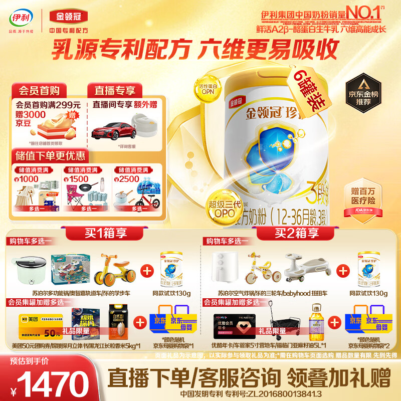 伊利金领冠珍护【三代OPO】幼儿A2β-酪蛋白奶粉3段1-3岁900g*6整箱装