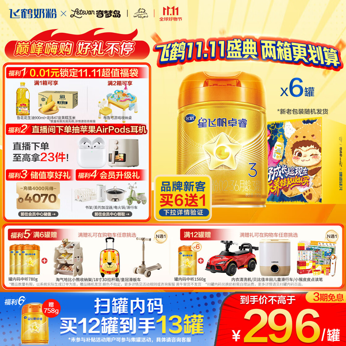飞鹤星飞帆卓睿Pro A2β酪蛋白3段(1-3岁)幼儿配方奶粉758g*6老爸抽检