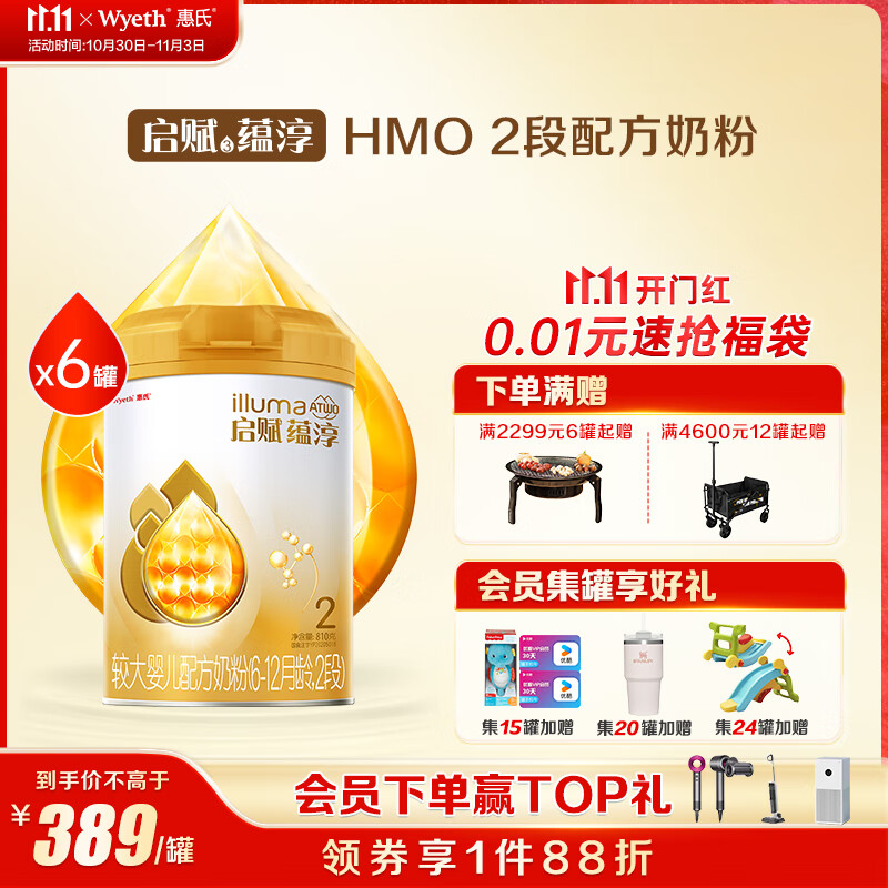 惠氏(Wyeth)启赋蕴淳A2进口HMO较大婴儿配方奶粉2段(6-12月)810g*6罐