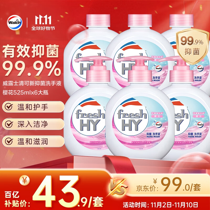 威露士清可新抑菌洗手液樱花525mlx6大瓶 泡沫丰富保湿带补充装