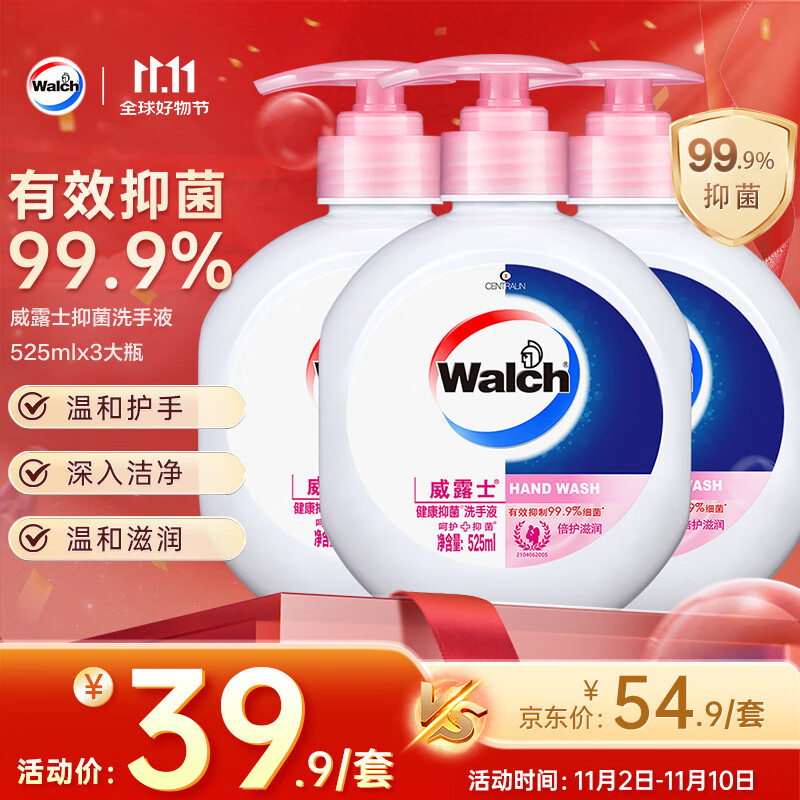 威露士(Walch)健康抑菌洗手液525ml+250ml补充装 倍护滋润儿童消毒抑菌家庭装