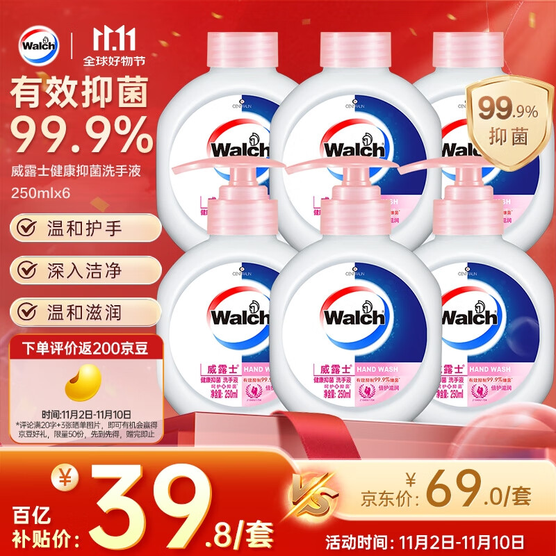 威露士健康抑菌洗手液250ml*6瓶 补充装儿童家庭装滋润抑菌99.9%