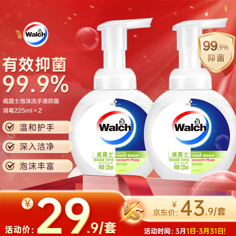 威露士泡沫洗手液青柠盈润225ml×2 杀菌99.9%家庭装泡沫丰富洗护手滋润
