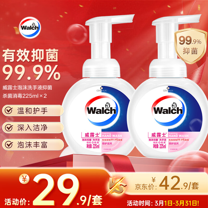 威露士泡沫洗手液抑菌杀菌消毒225ml×2 泡沫型儿童泡泡洗手液护手滋润