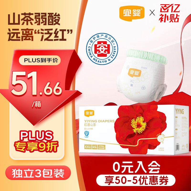 宜婴红花山茶弱酸拉拉裤柔软婴儿尿不湿XXL45片透气小内裤