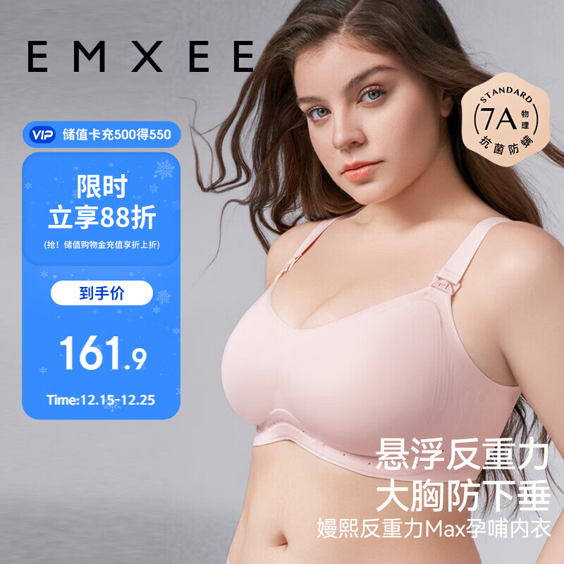 嫚熙(EMXEE)悬浮反重力大胸专用孕妇哺乳内衣聚拢防下垂孕期产后Max文胸 粉XL