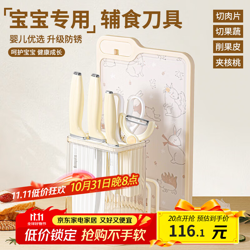 苏泊尔(SUPOR)菜板剪刀辅食工具厨房不锈钢宝宝砧板套装刀具套装刀座工具 宝宝辅食工具套装【6件套】
