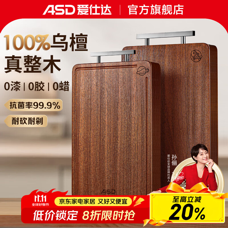 爱仕达砧板乌檀整木菜板防霉抗菌家用实木砧板双面切菜板案板厨房专用 【99.9%抗菌】34*22*2.5cm 1-2人
