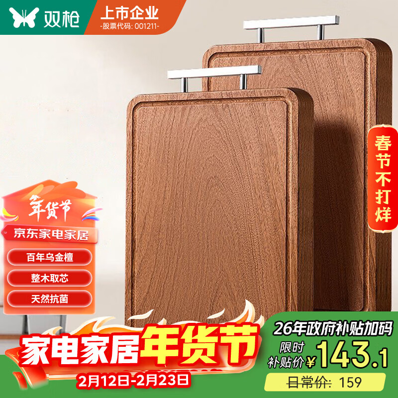双枪乌檀木整木菜板实木抗菌防霉家用切菜板案板大号砧板 【整木芯材】41*26cm(含把手)