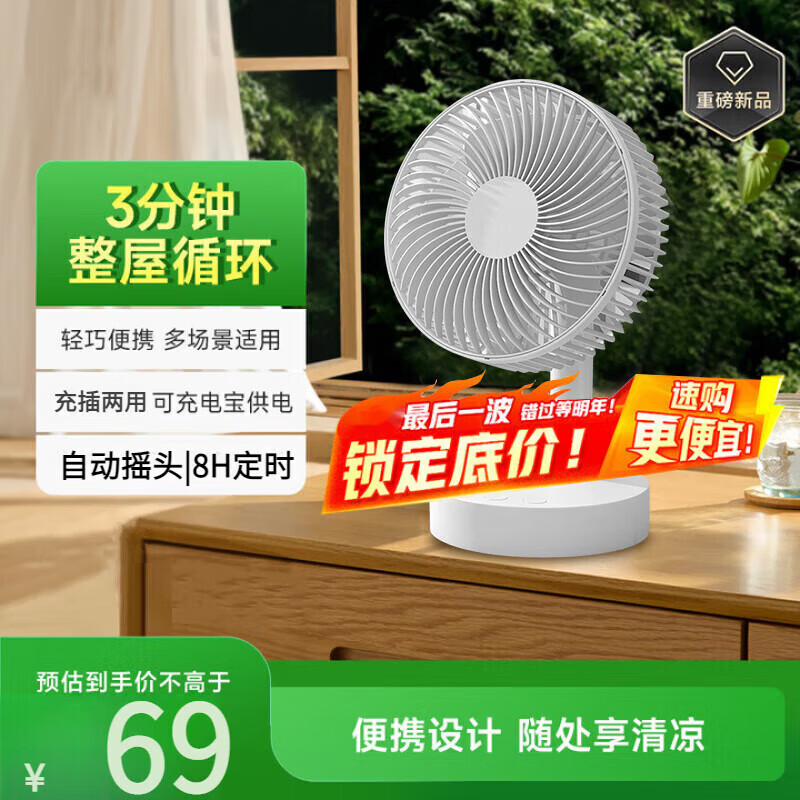 小米白桌面小风扇静音空气循环USB可充电台式家用办公室学生宿舍床头大风力便携制冷电风扇大扇面 旗舰升级款-摇头+定时-插电款