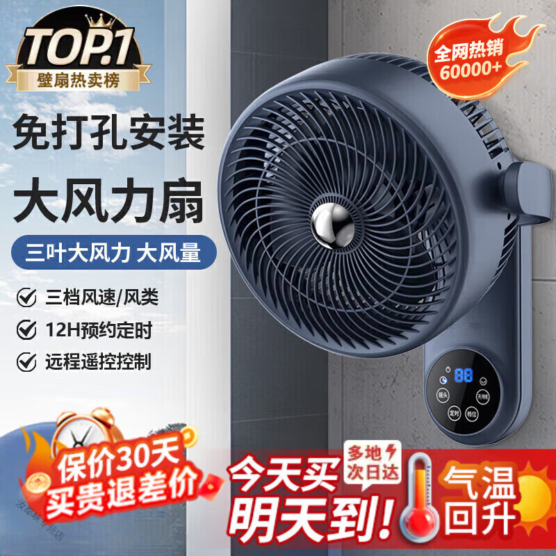 小米锅巴壁扇电风扇家用小型壁挂式空气循环壁扇厨房卫生间免打孔挂墙壁 遥控款式-8字摇头(免打孔/打孔)1