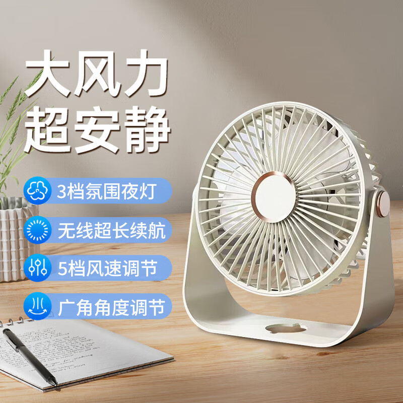 小米白色2026新款桌面小风扇静音空气循环USB可充电台式家用办公室学生宿舍床头大风力便携制冷电挂璧扇 三挡灯光丨五档风速-米色 常规款