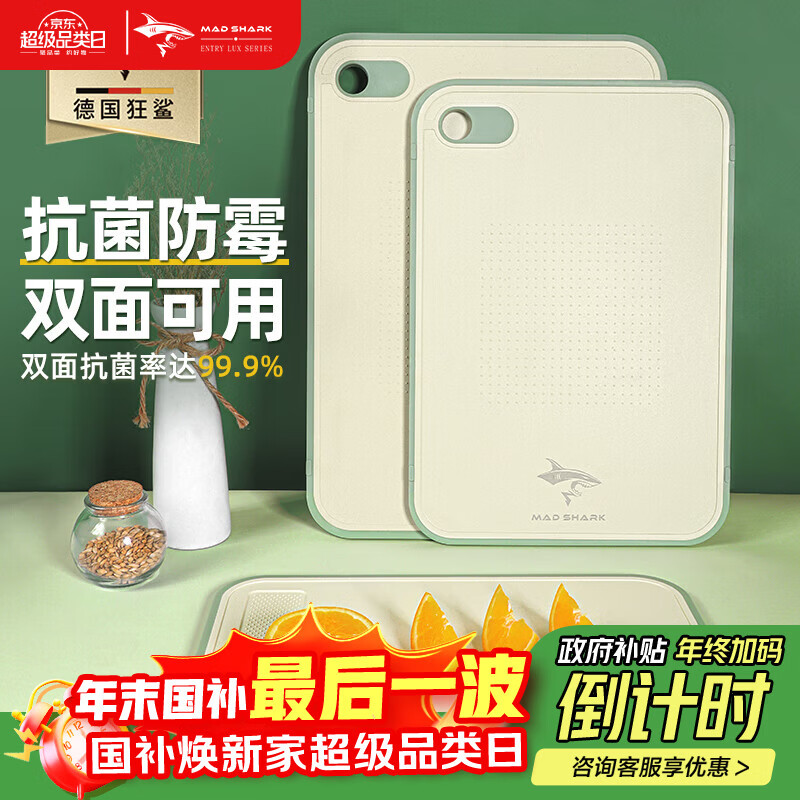 MAD SHARK德国进口切菜板小麦秸秆双面抗菌防霉砧板家用食品级水果熟食案板 抗菌绿色-大号39.7*28*0.9CM