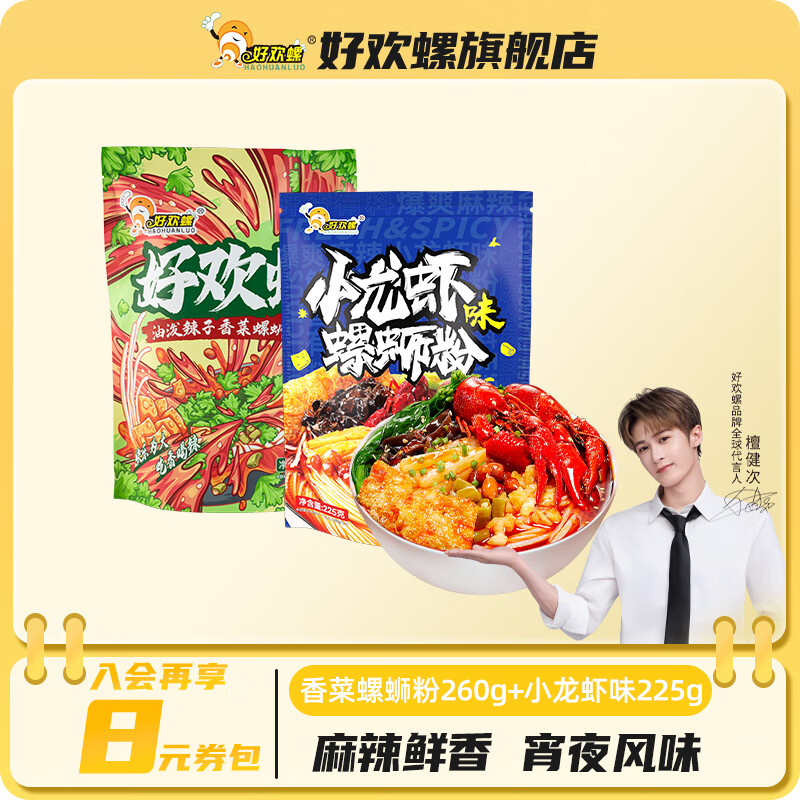 好欢螺(HAOHUANLUO)螺蛳粉经典原味柳州特产袋装方便速食酸辣粉丝米粉螺丝粉夜宵小吃 香菜螺蛳粉260g+小龙虾味225g
