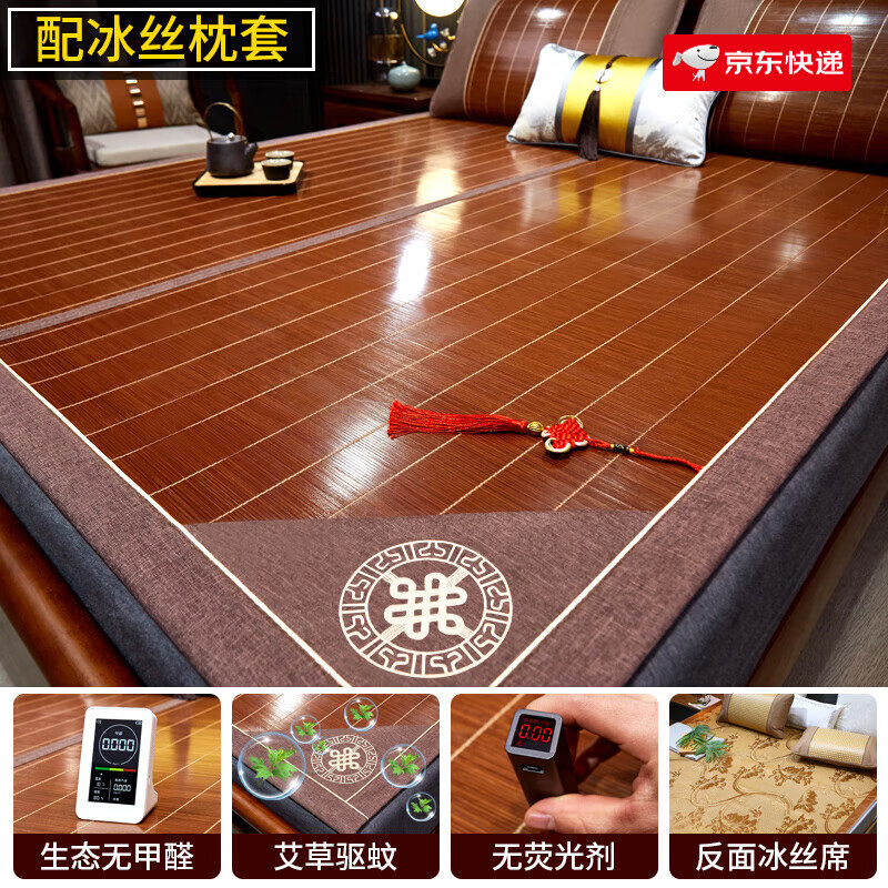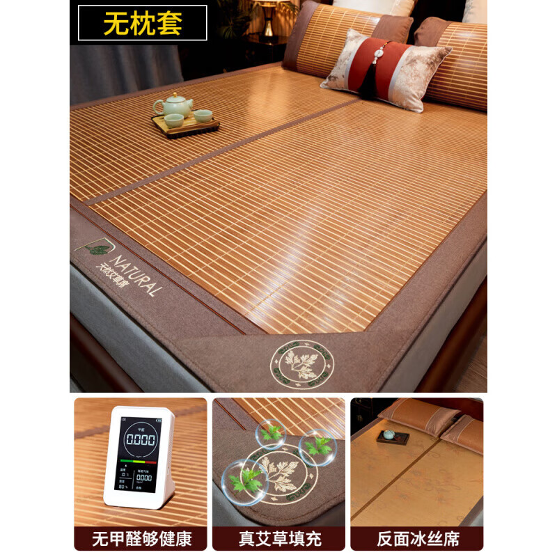 席饰多 高档凉席竹席家用双面竹凉席可折叠碳化无染色两用竹凉席三件套 艾草纹竹+反面冰丝【配藤枕套】 【1.2米床适用】120x195cm