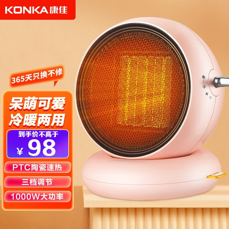康佳(KONKA)取暖器暖风机家用台式电暖器小型冷暖电暖气节能热风扇办公室暖风扇迷你热风机卧室烤火炉 直流电机PTC速热+三档(粉)