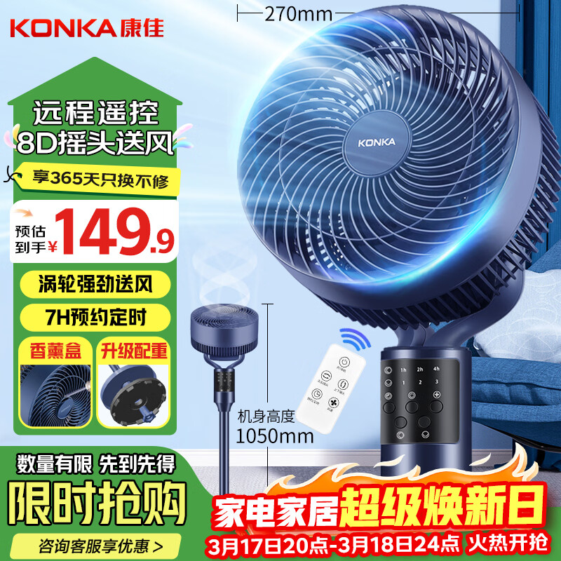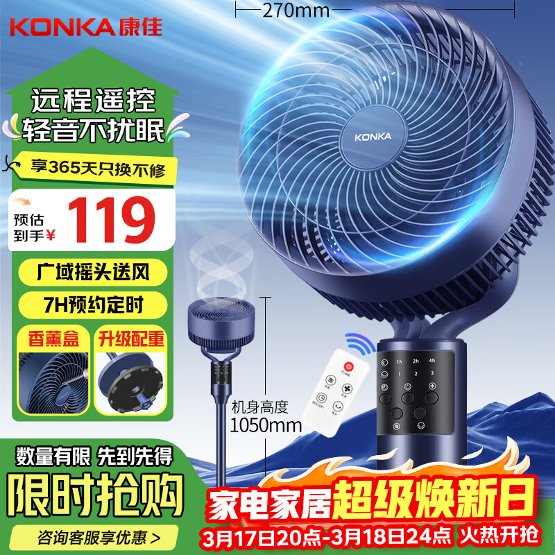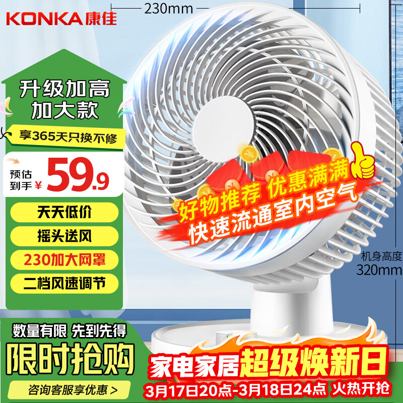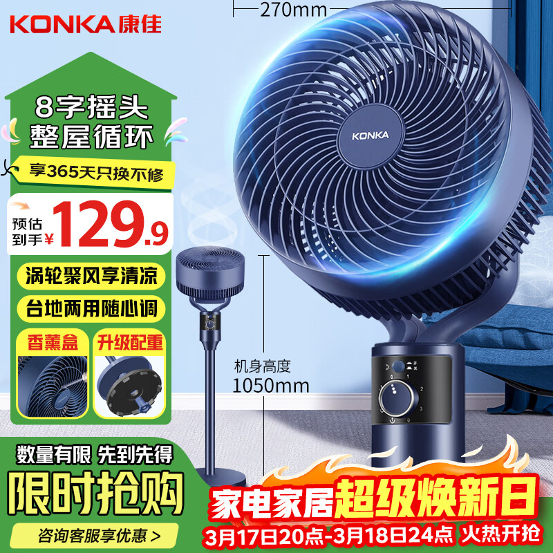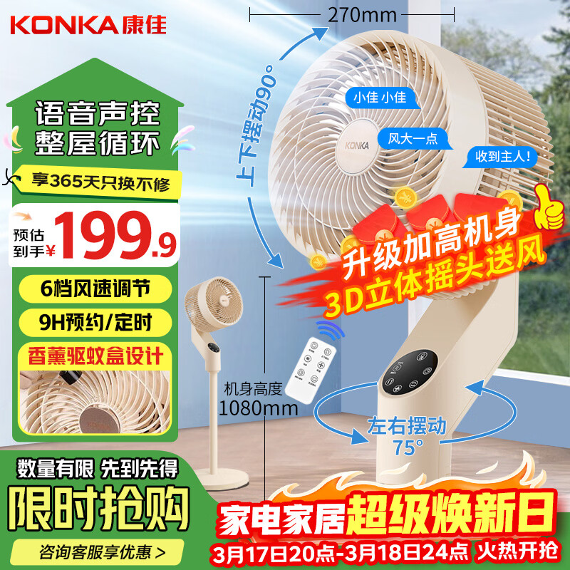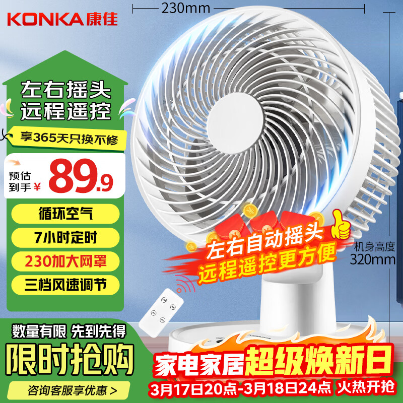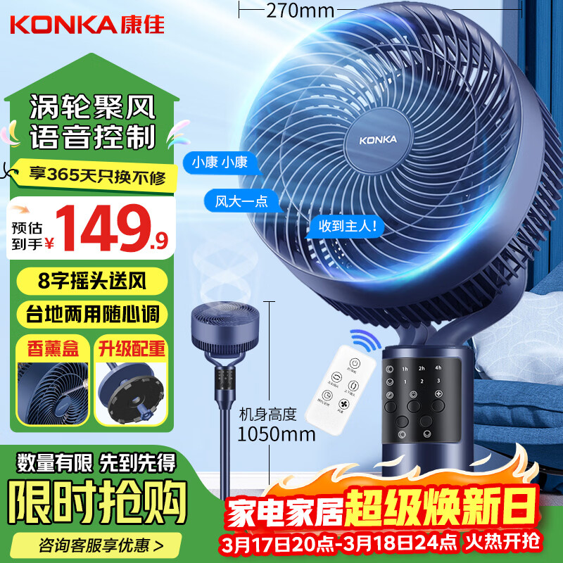 康佳(KONKA)空气循环扇电风扇家用风扇智能语音小风扇八字摇头换气扇台式电扇遥控交流定频落地扇KXHS-1801W-P