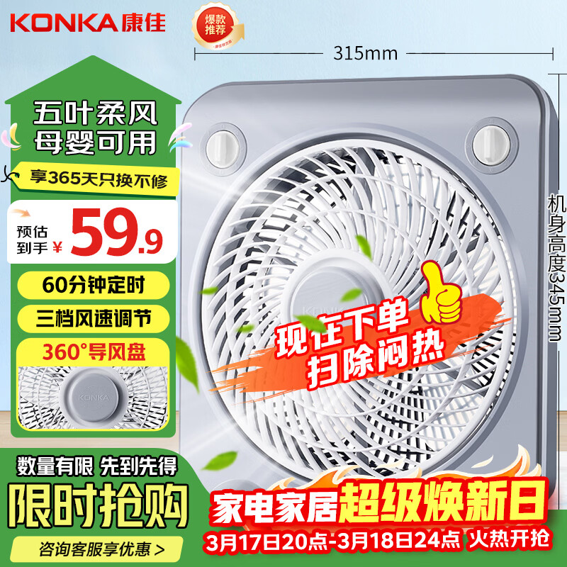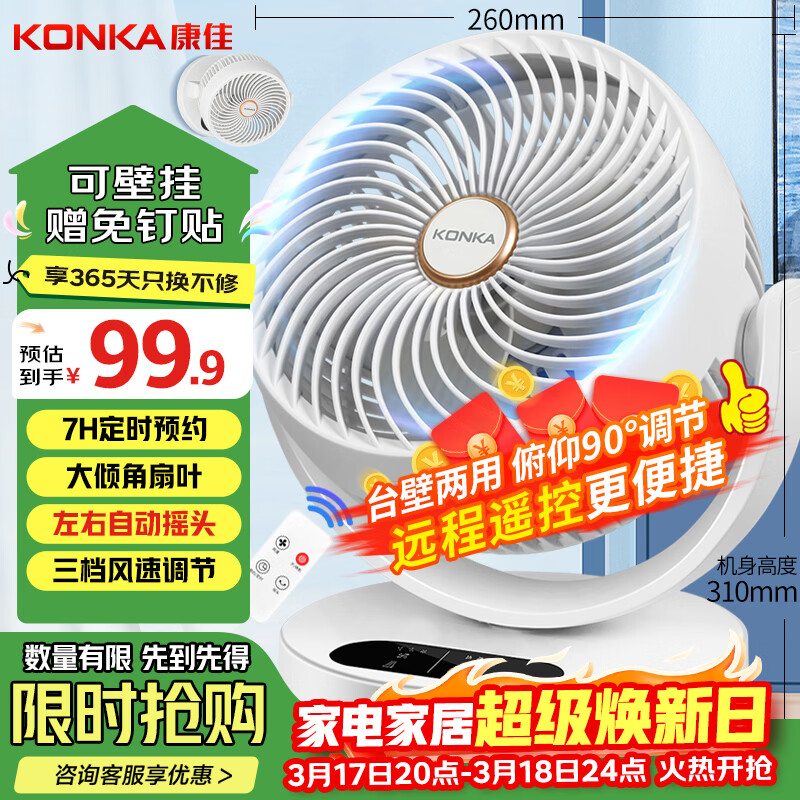 康佳(KONKA)空气循环扇家用风扇遥控办公室台式桌面电风扇厨房换气扇摇头壁挂电扇交流定频小风扇KXHS-1511E-P