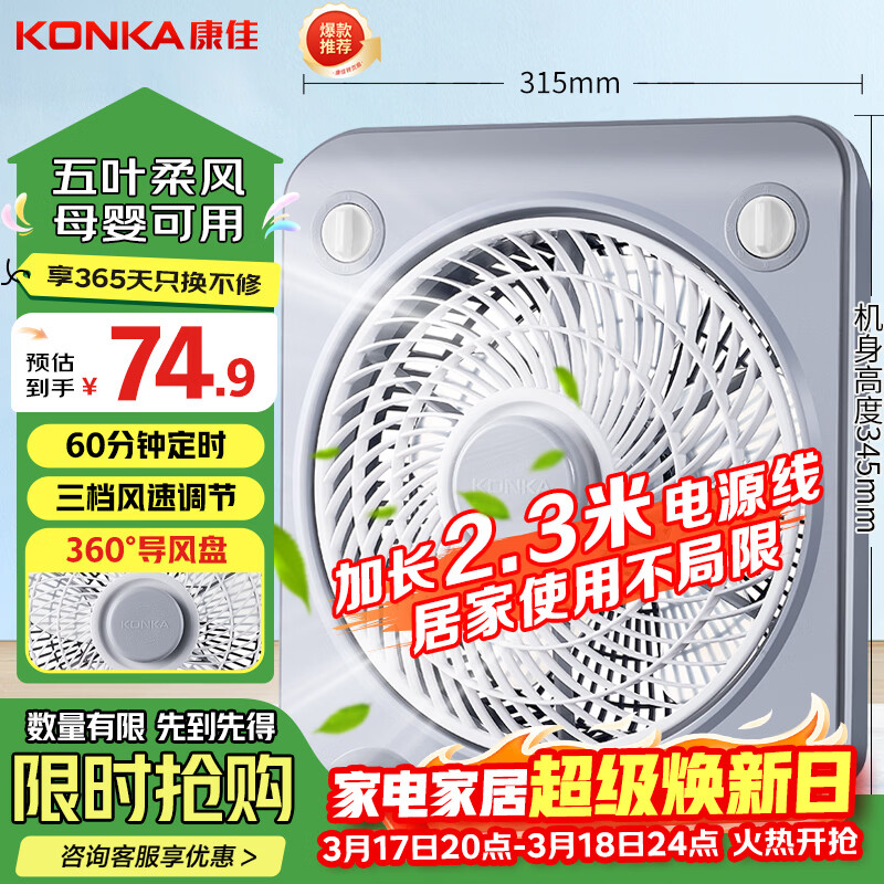 康佳(KONKA)家用风扇宿舍电风扇转页扇加长电源线台扇桌面交流定频小风扇KF-25HY37延长线