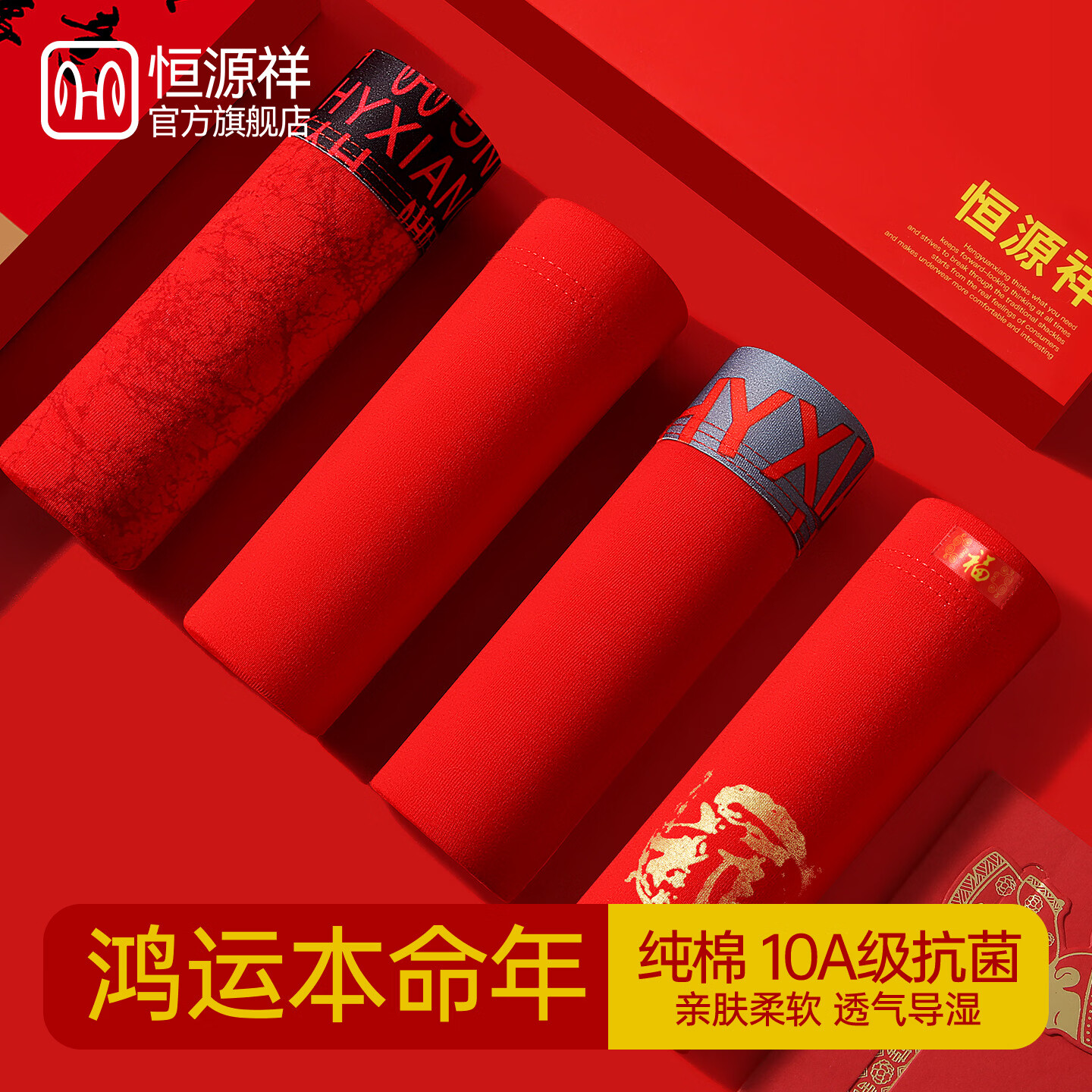 恒源祥【10A抗菌】本命年男士内裤纯棉红色内裤男马年新品骐骥红4条袋装