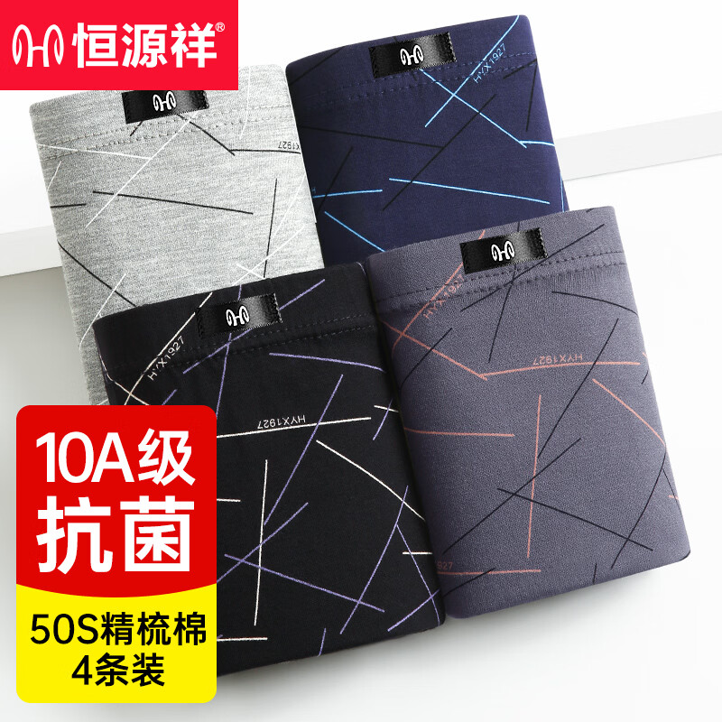 恒源祥10A抗菌男士内裤男纯棉平角裤防螨四角男生短裤衩大码4条装