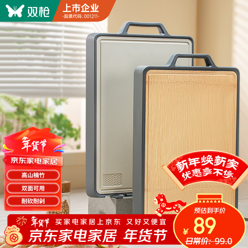 双枪天然整竹+pp菜板 防霉砧板家用双面案板切菜粘板43.5*29.5*1.8cm