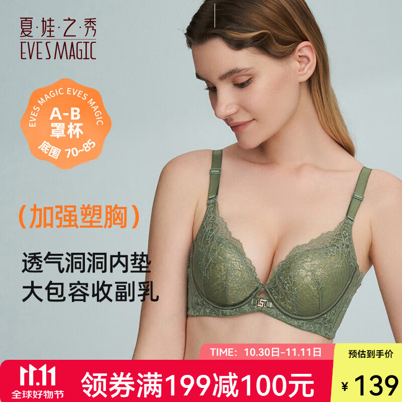 夏.娃.之.秀调整型文胸收副乳上托防下垂上托透气小胸洞洞杯胸罩线下同款内衣 慵懒绿(小胸聚拢A杯) 75A