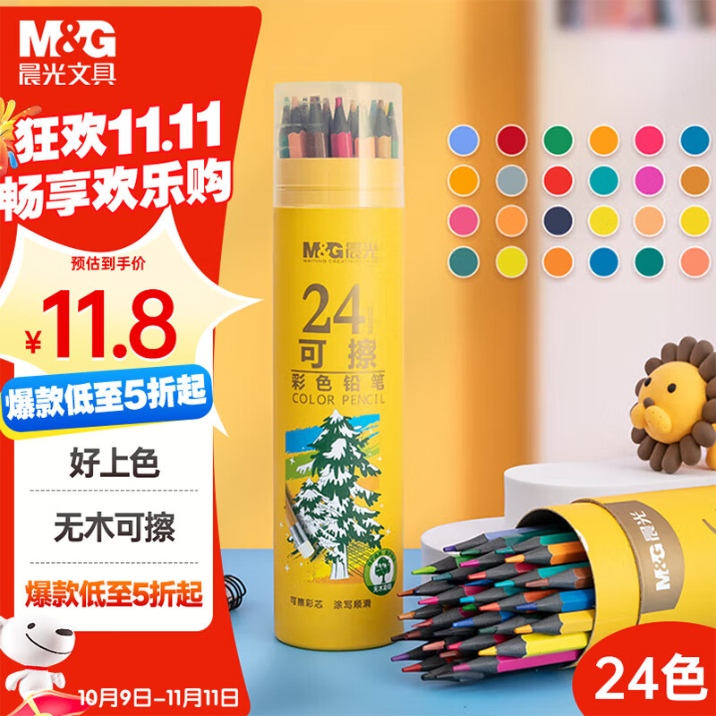 晨光(M&G)文具24色无木环保彩色铅笔可擦彩铅小学生美术绘画填色笔手绘涂色画笔黄筒生日礼物AWPQ0508