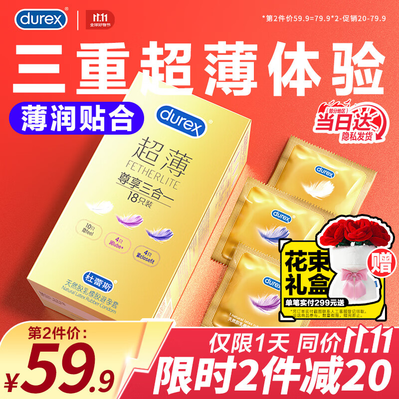 杜蕾斯(durex) 避孕套 安全套 超薄尊享三合一18只男女用套套成人计生情趣用品