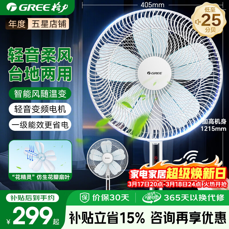 格力(GREE)家用变频电风扇智能恒温转页扇 2025年新款柔风安睡电扇一级能效节能转叶扇幸运草风扇遥控落地扇 FDZ-35X69Bg5【花精灵-仿生花瓣扇叶】