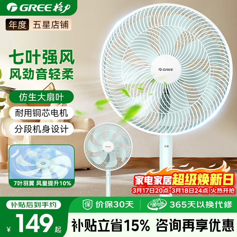 格力(GREE)【超级单品】七叶轻音低噪立式电风扇家用柔风落地扇台式桌面风扇大风量节能宿舍电扇 FS-3015h7【爆款竹青色】