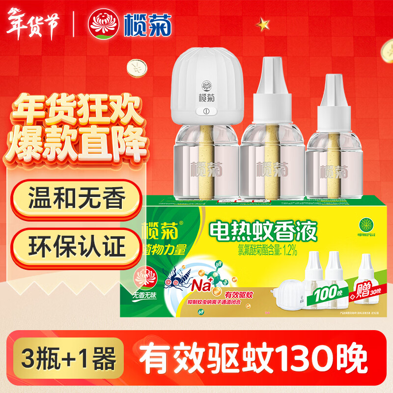 榄菊电蚊香液3瓶130晚+加热器 无香型基孔肯雅热防蚊驱蚊液电蚊香