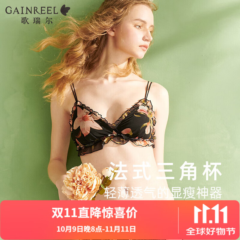 Gainreel歌瑞尔舒适透气性感蕾丝内衣女无钢圈法式三角杯柔软支撑上托减龄文胸罩 典雅黑220155A 70B