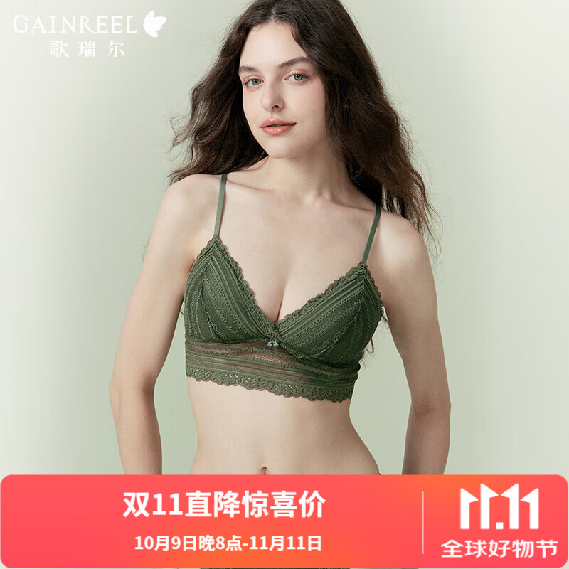 Gainreel歌瑞尔舒适透气性感蕾丝内衣女无钢圈法式三角杯柔软支撑上托减龄文胸罩 草木绿 200824A 70A