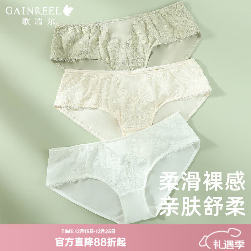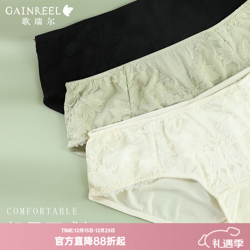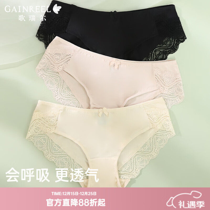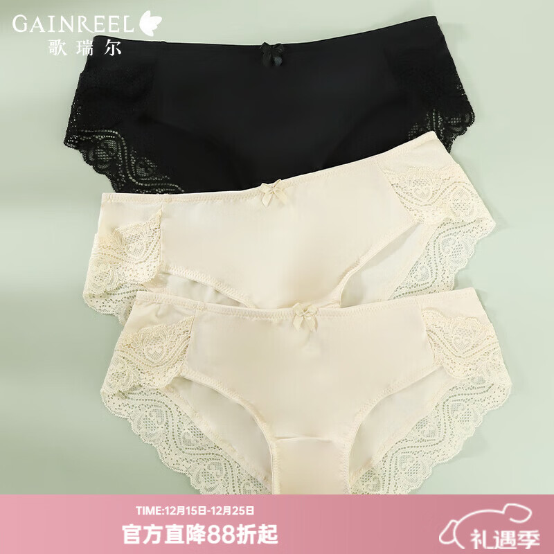 Gainreel歌瑞尔热销3条装裸感丝滑透气蕾丝内裤女士内裤棉裆亲肤平角裤衩 月夜黑+月牙肤+月牙肤 3条 S