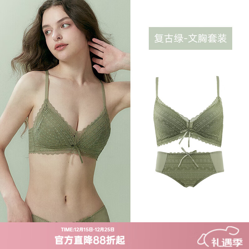 Gainreel歌瑞尔热销法式蕾丝性感内衣纯欲小胸聚拢内衣女薄款无钢圈文胸罩 复古绿文胸套装 85B (若拍下套装,内裤配XL)