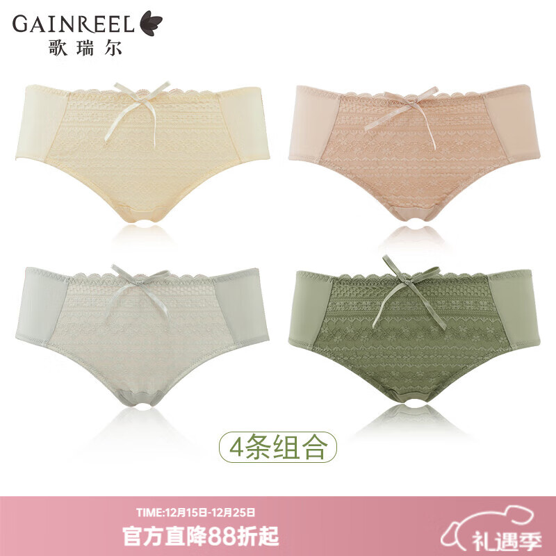 Gainreel歌瑞尔4条装套组柔软亲肤舒适法式蕾丝内裤女性感纯欲棉裆中腰平角底裤 奶油色+烟粉色+浅灰色+复古绿 M