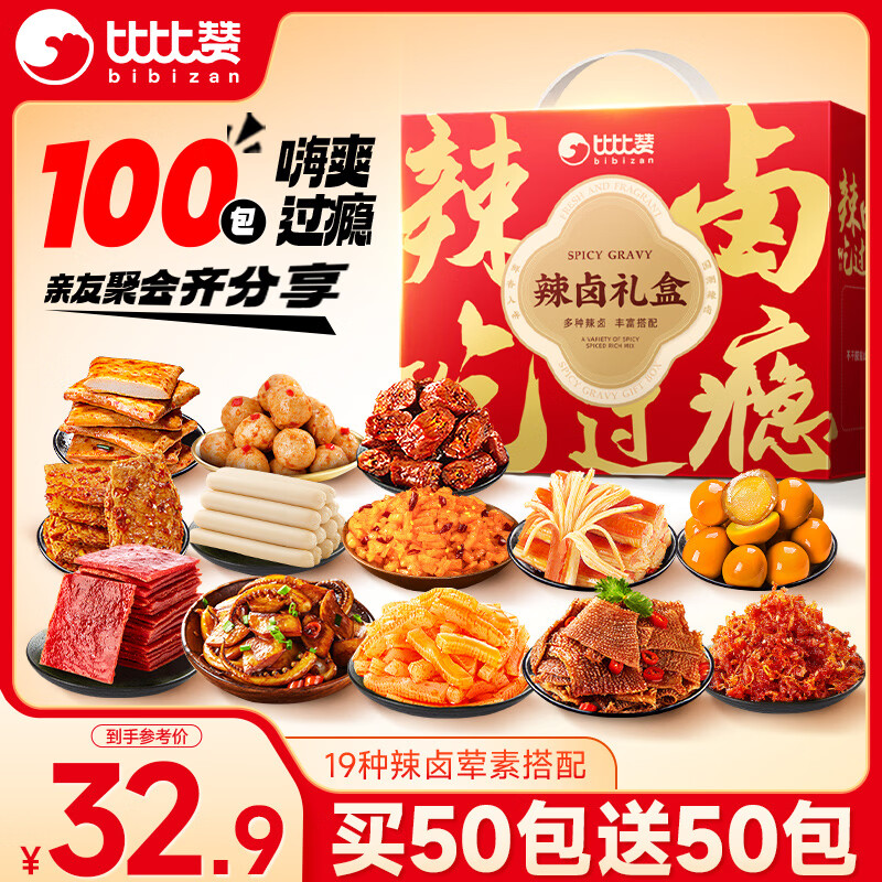 比比赞(BIBIZAN)辣卤零食大礼包100包辣条魔芋爽送女友荤素卤味肉干送礼团购