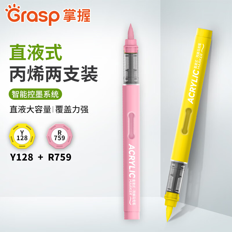 掌握直液式软头丙烯马克笔可水洗高覆盖学生绘画笔不易透色可叠色儿童美术水彩笔层叠礼盒开学季礼物 粉色+黄色【双支补充装组合】