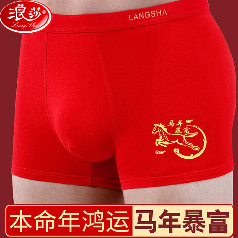 浪莎大红内裤男纯棉本命年属马年骐骥红4条礼物大码裤衩平角男内裤