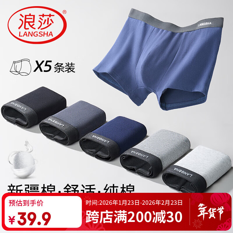 浪莎5条男士内裤男纯棉10A抗菌平角裤透气中腰男式四角短裤衩男生裤头